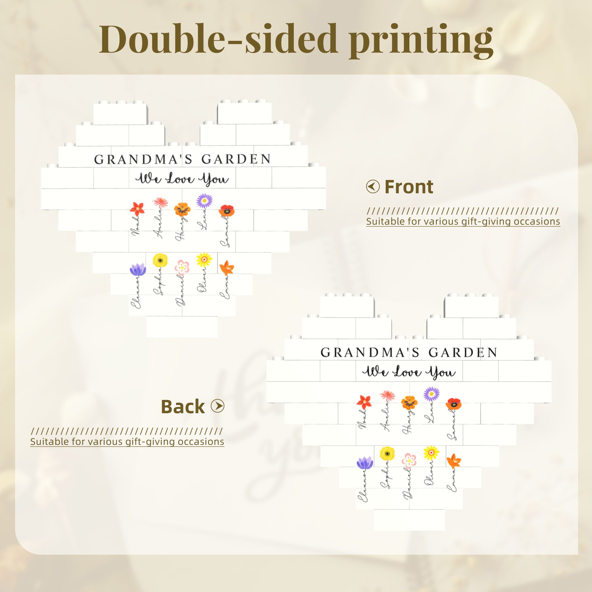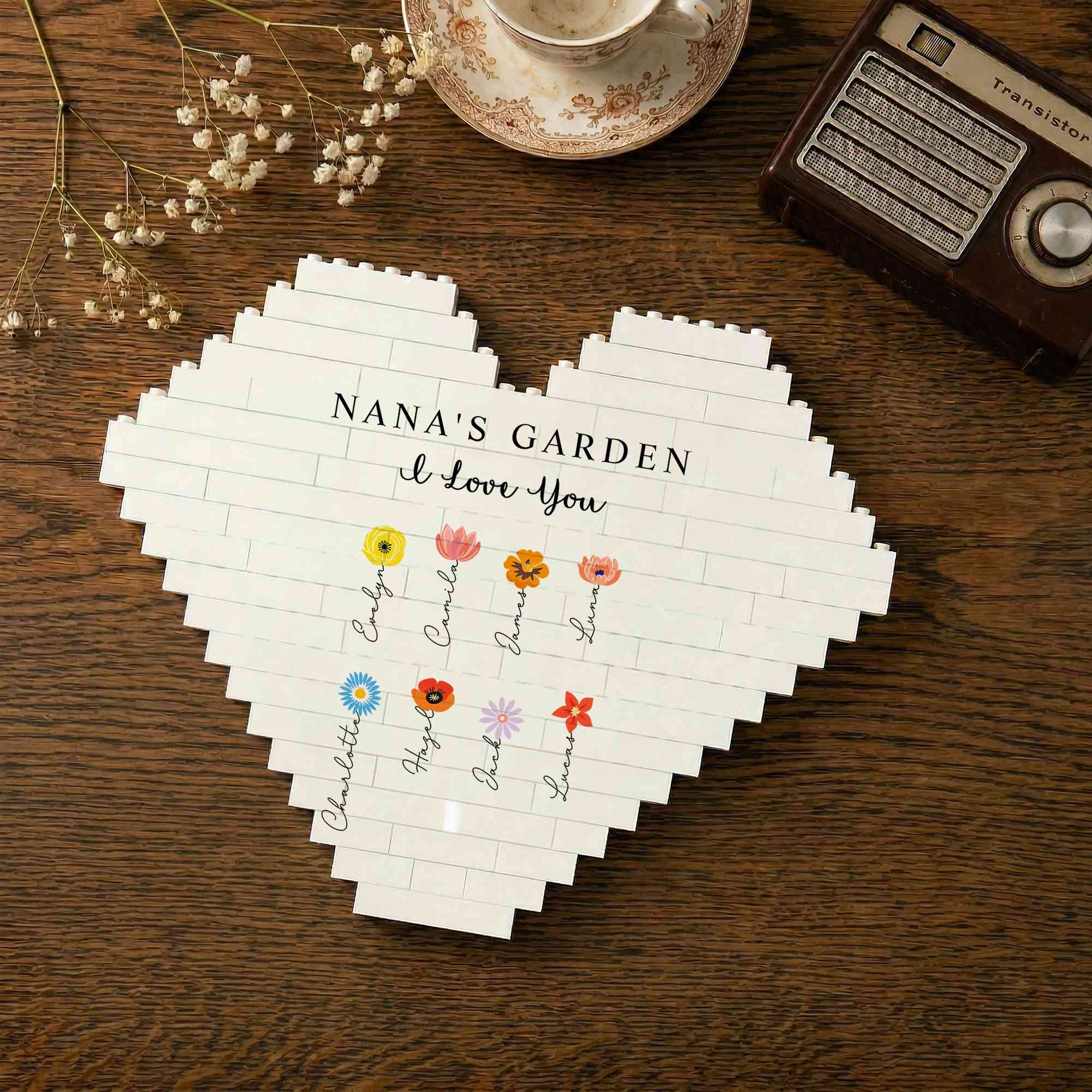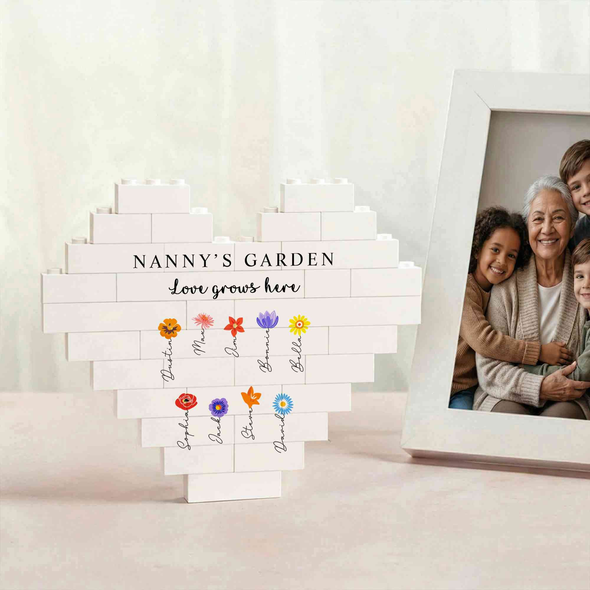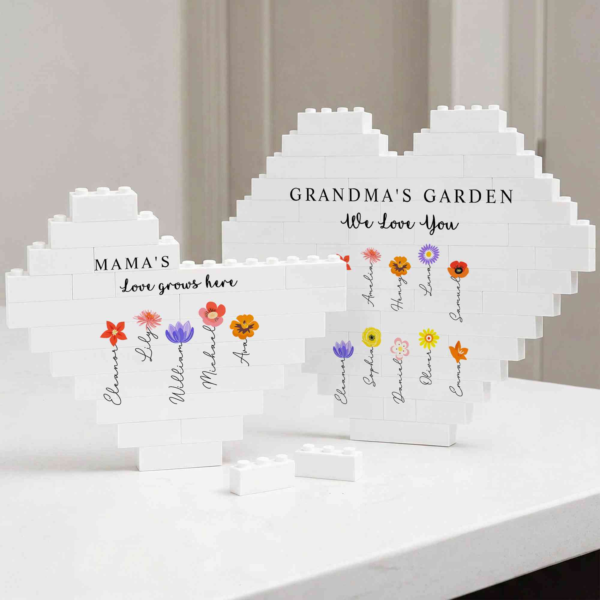 | Style | Custom Names Colorful Birth Flowers Grandma’s Garden Heart-Shaped Building Block |